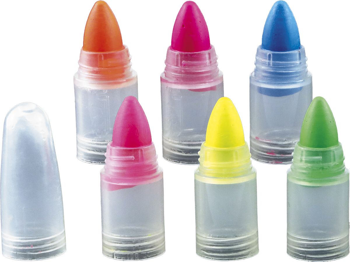 Kredki segmentowe - 6 wymiennych kolorów w jednej kredce. Przeznaczone do makijażu twarzy i ciała. Łatwe w użyciu i przechowywaniu. Nie rozmazują się. Komplet zawiera 6 kolorów fluorescencyjnych.