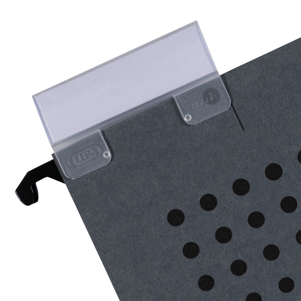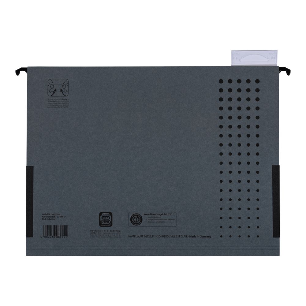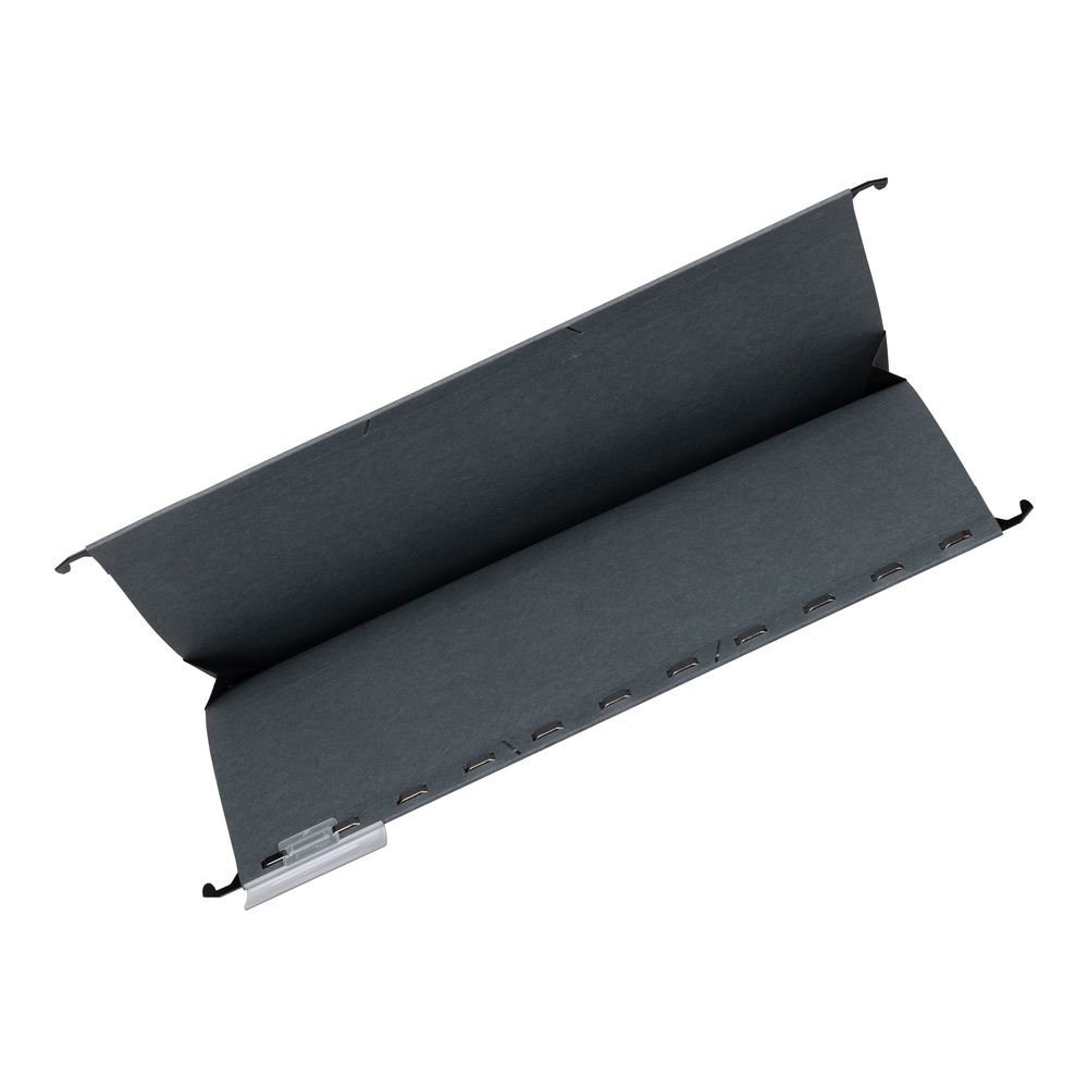 Teczki zawieszkowe w formacie A4, wykonane z mocnego kartonu w grafitowym kolorze. U góry znajduje się przesuwny szyldzik z wymienną etykietą opisową. Harmonijkowe, płócienne boki zapobiegają wysuwaniu się dokumentów. W środku dwie pary nacięć do pasków skoroszytowych. Każda teczka może pomieścić do 330 kartek.