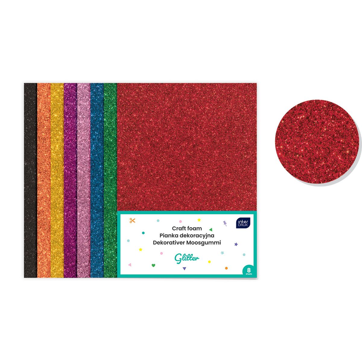 Opakowanie zawiera 8 arkuszy pianek w rozmiarze A4 jednostronnie pokrytych brokatem.