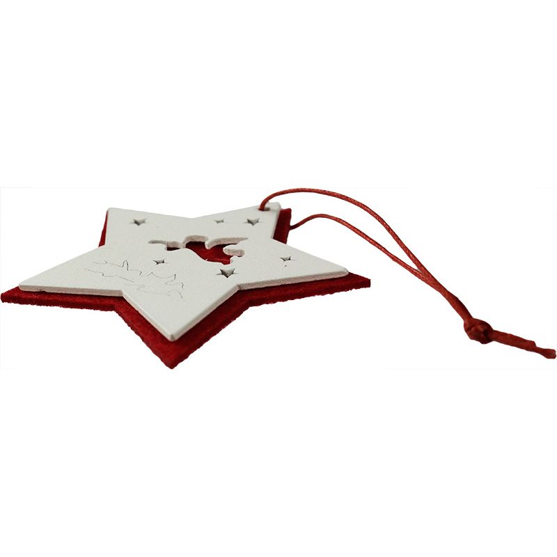 Zawieszki wykonane z połączenia filcu i drewna. Świetnie sprawdzą się w dekoracji okien, luster, świątecznych drzewek, wianków, świeczników a nawet prezentów. Kształt: gwiazdki z aniołem z trąbką, wymiary: 78 x 70 mm, kolor: białe drewno na czerwonym filcu. 3 szt.