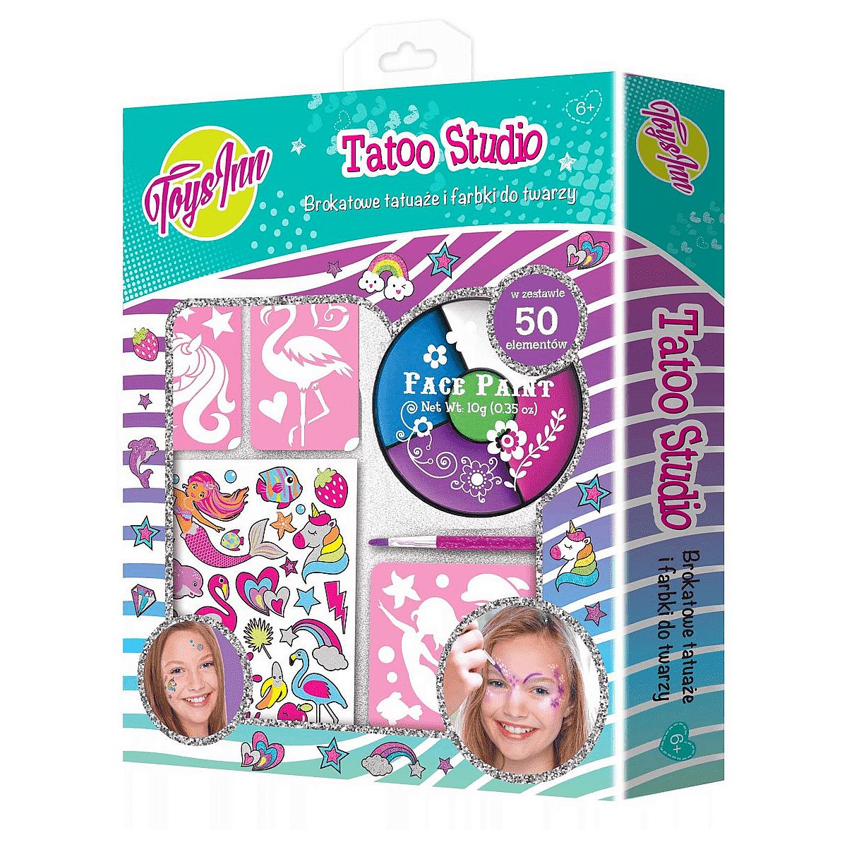 Zestaw do malowania twarzy, idealny na imprezę dla dzieci. Każdy animator bez problemu stworzy piękny tatuaż, dzięki dołączonym szablonom oraz brokatowym tatuażom. Farbki do twarzy w 5 kolorach (biały, niebieski, różowy, fioletowy i zielony), 3 szablony 45 brokatowych tatuaży 1 pędzelek Zestaw od 6 roku życia.