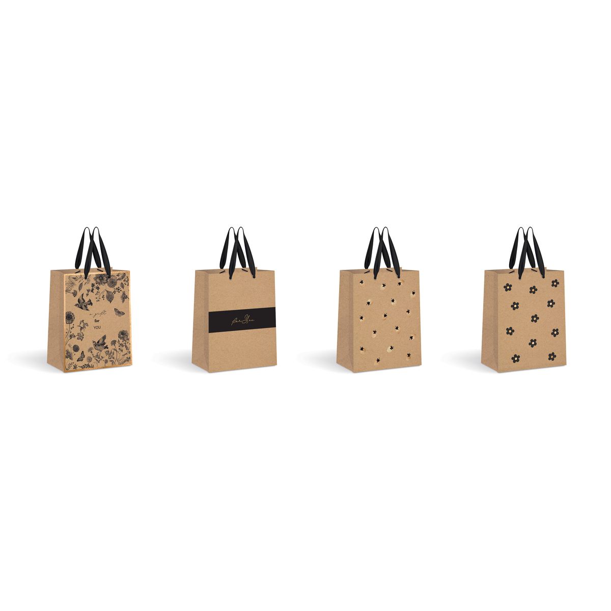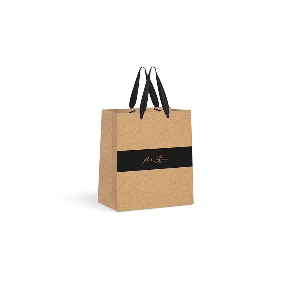 Wykonana z naturalnego, wytrzymałego papieru kraft 150 g. Wzmocniony, sztywny spód. Eleganckie i przyciągające wzrok, złote detale. Uchwyty wykonane z czarnego sznurka. Idealna do szybkiego i efektownego pakowania prezentów. Wymiary: 26,5x33x13 cm.