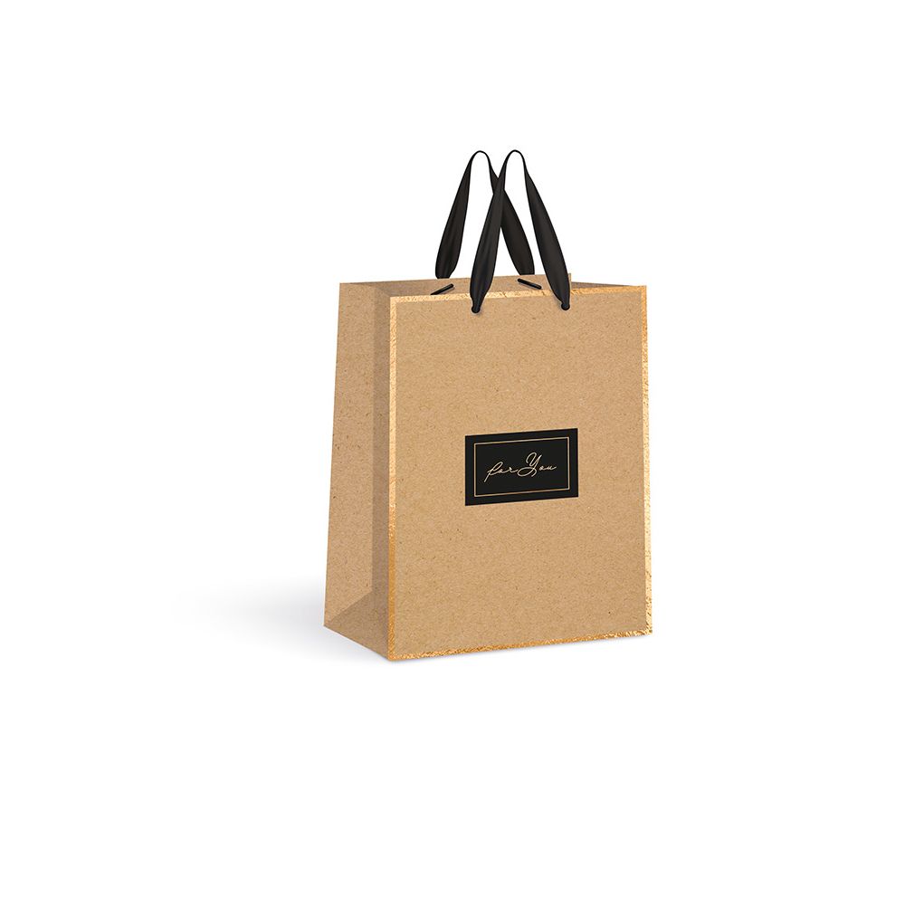 Wykonana z naturalnego, wytrzymałego papieru kraft 150 g. Wzmocniony, sztywny spód. Eleganckie i przyciągające wzrok, złote detale. Uchwyty wykonane z czarnego sznurka. Idealna do szybkiego i efektownego pakowania prezentów. Wymiary: 33x46x10 cm.