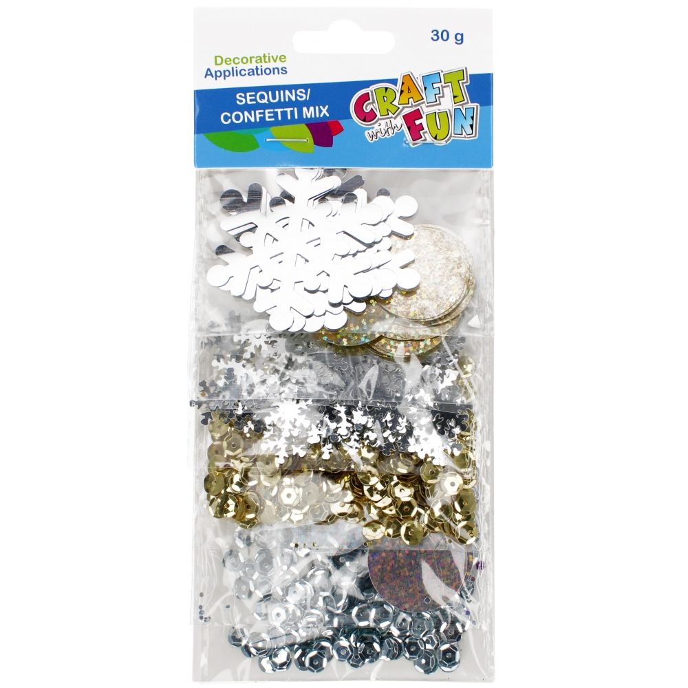 Zalety produktu: Przy pomocy Cekinów CRAFT WITH FUN można zaprojektować własne ozdoby lub dekoracje. Idealne do wykonywania wszelkich prac dekoratorskich, jak również do zabaw plastycznych, do wzbogacenia ozdób wykonanych techniką decoupage. Używaj tych produktów w połączeniu z innymi akcesoriami oraz kompletami z serii CRAFT WITH FUN Opakowanie zawiera mix 6 metalicznych cekinów . W opakowaniu znajduję się 30 g. cekinów. Cekiny wykonane z plastiku. Wymiary/waga: wymiary opakowania szer. x wys. cm : 9x20, waga opakowania kg : 0,04 kg. Produkt przeznaczony dla dzieci w wieku: 3 . Iner 12 szt. Karton zbiorczy 144 szt.