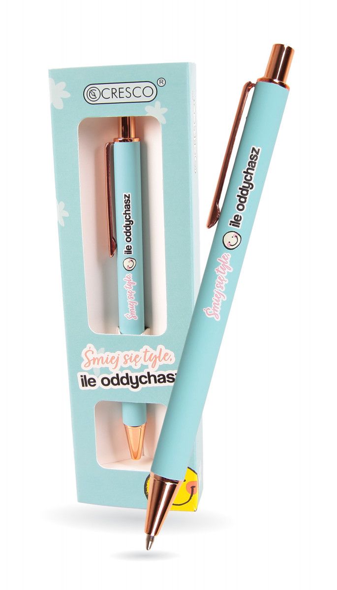 Długopis automatyczny z wymiennym wkładem 1mm. Kobieca kolorystyka, softowy, pastelowy korpus ze wykończeniami w odcieniach różowego złota. Nadruk na długopisie i pudełeczku to „Śmiej się tyle, ile oddychasz”. Dodatkowo wzbogacony nadruk o wyjątkową grafikę. Długopis zapakowany w prezentowe etui GB, w sam raz na upominek dla NIEJ.Nieodpowiednie dla dzieci poniżej 3 lat. Sugerowany wiek +5. Ostre zakończenia. Ryzyko zranienia oka. Zawiera małe elementy. Ryzyko połknięcia, zadławienia, uduszenia. Do użytku pod nadzorem osoby dorosłej.