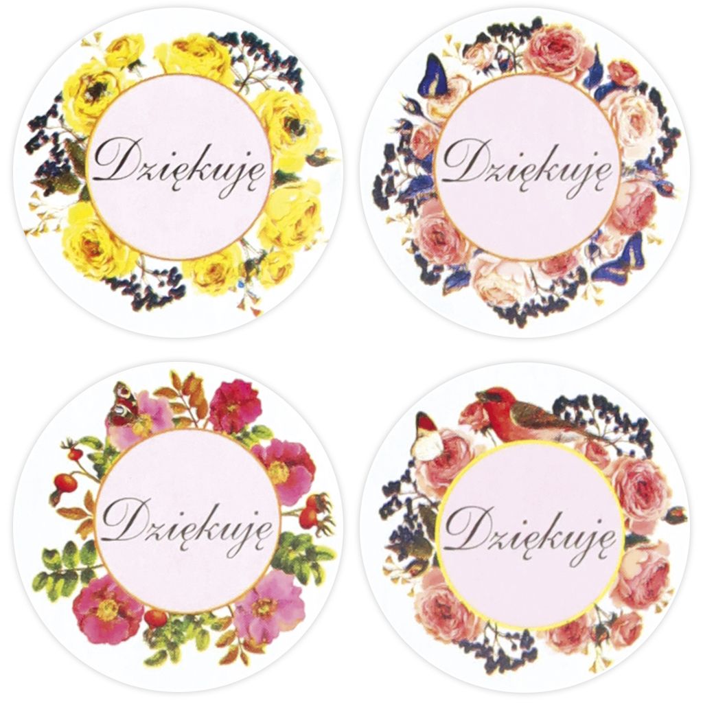 Naklejki papierowe na taśmie, 8 wzorów kwiatowych z napisem „Dziękuję”. 500 sztuk.