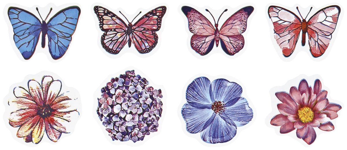 Naklejki papierowe na taśmie, 8 wzorów: motyle, kwiaty, mix rozmiarów, szerokość taśmy 28 mm. 500 sztuk.