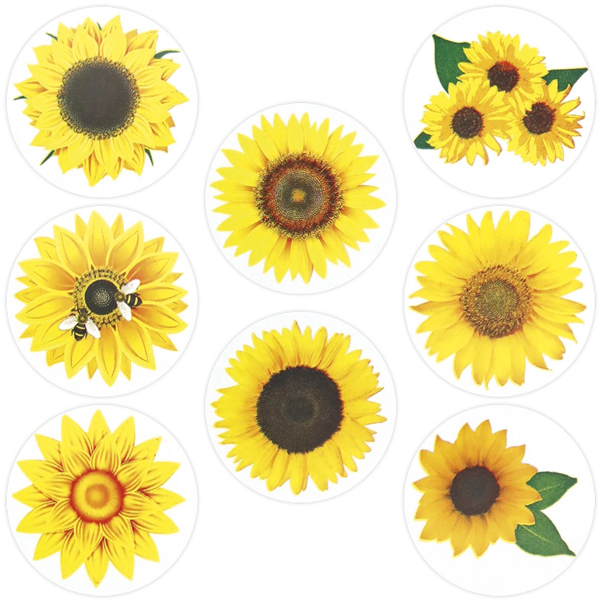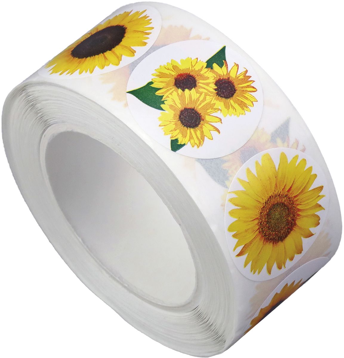 Naklejki papierowe na taśmie, 6 wzorów słoneczniki, żółte, średnica 25 mm, szerokość taśmy 28 mm. 500 sztuk.