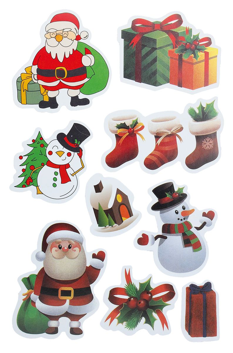 Naklejki papierowe, 10 plansz, wzory: Mikołaje, bałwanki, prezenty, skarpety. 9 wzorów - 90 sztuk.