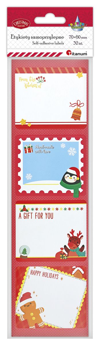 Etykiety samoprzylepne, wzory: Boże Narodzenie, wymiar etykiety: 70x60 mm, 8 plansz, 32 sztuki.