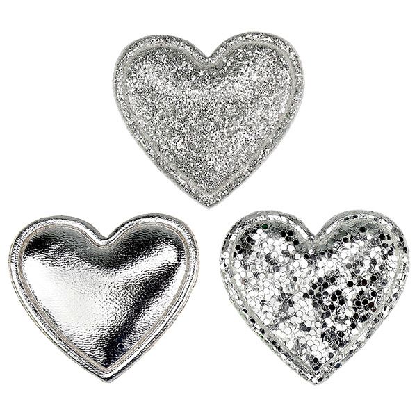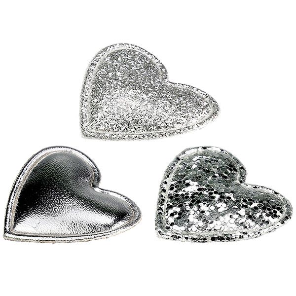 Dekoracje materiałowe, wzór: serca, wymiary: 32x30 mm, 3 wzory: drobny brokat, duży brokat, gładkie, kolor: srebrne. 12 sztuk.