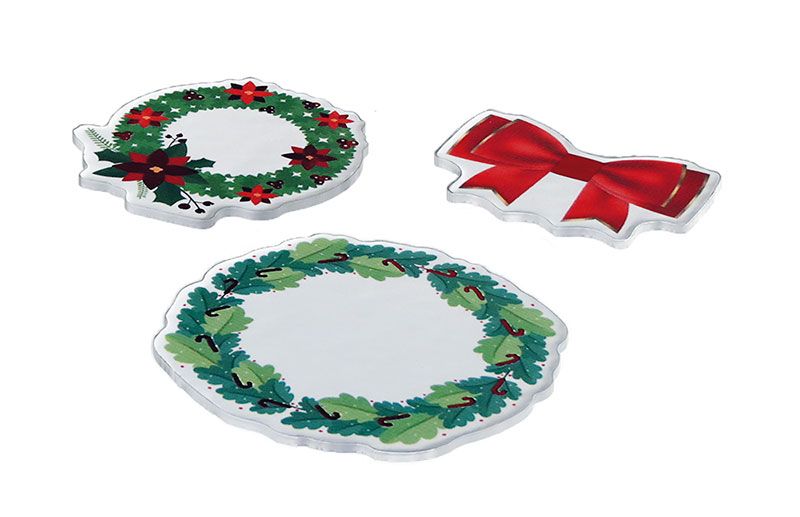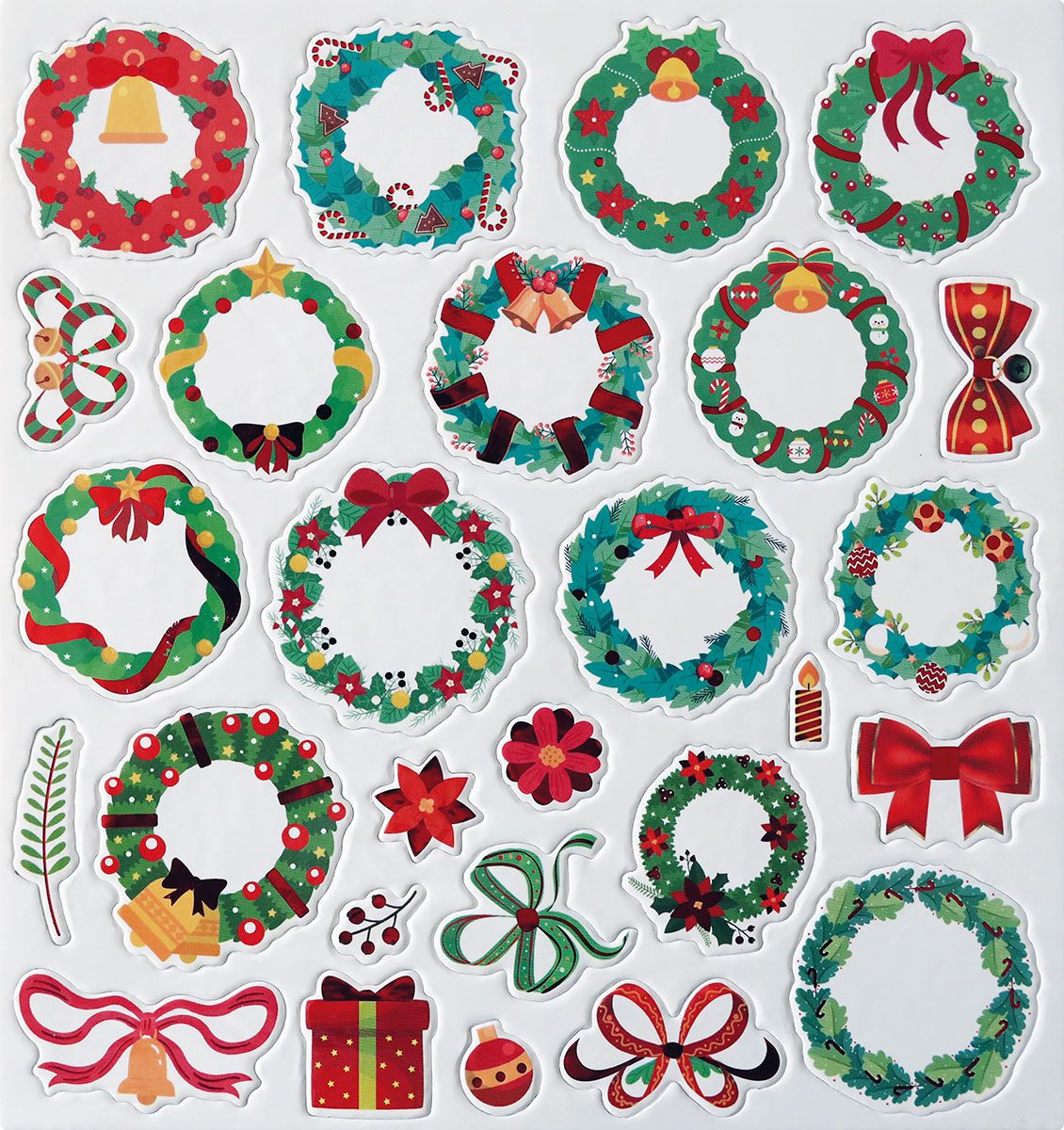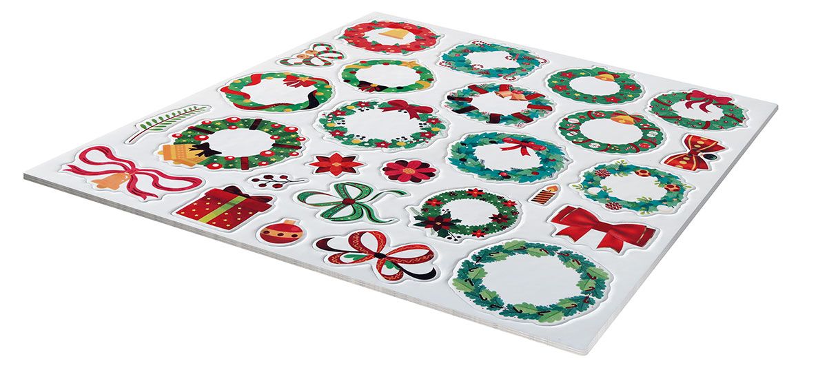 Naklejki 3D, papierowe na filcowej podkładce, wzory: wianki świąteczne, średnica 30-40 mm, mix. 27 sztuk.