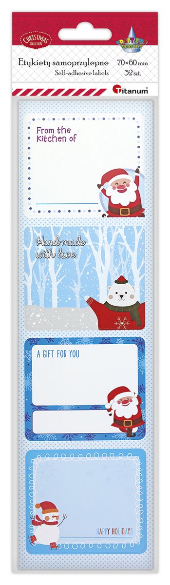 Etykiety samoprzylepne, wzory: Boże Narodzenie, wymiar etykiety: 70x60 mm, 8 plansz, 32 sztuki.