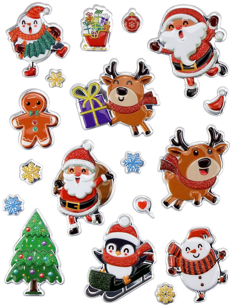 Naklejki wypukłe, wzory: Mikołaje, bałwanki, Ciastek, pingwiny, renifer, choinka. 18 sztuk.