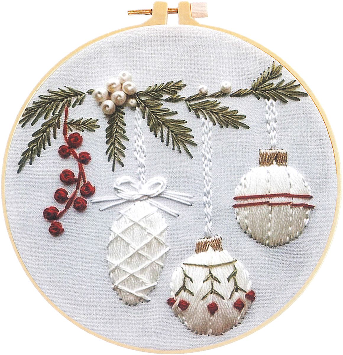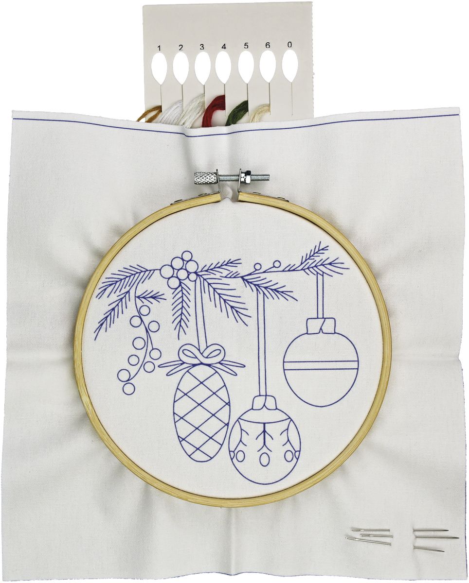 Gotowy zestaw do haftowania, zawierający: tkaninę 24x24 cm ze szkicem wzoru, tamborek o średnicy roboczej 15 cm, zestaw mulin, 3 igły, instrukcję w języku polskim. Wzór: gałązka jodły z bombkami.