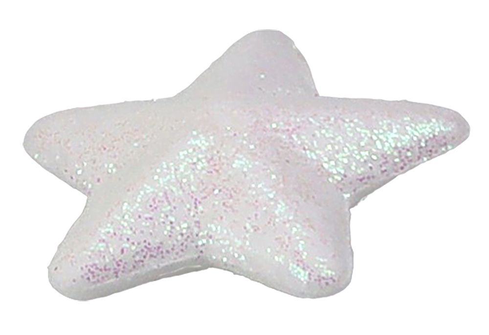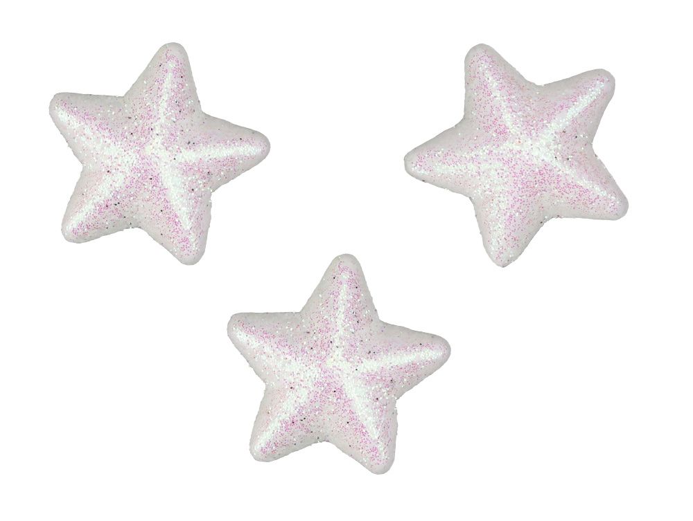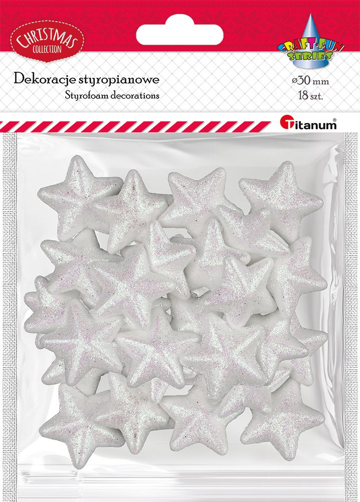 Styropianowe gwiazdki, wymiary: 30x28 mm, grubość: 10 mm, brokatowe białe. 18 sztuk.