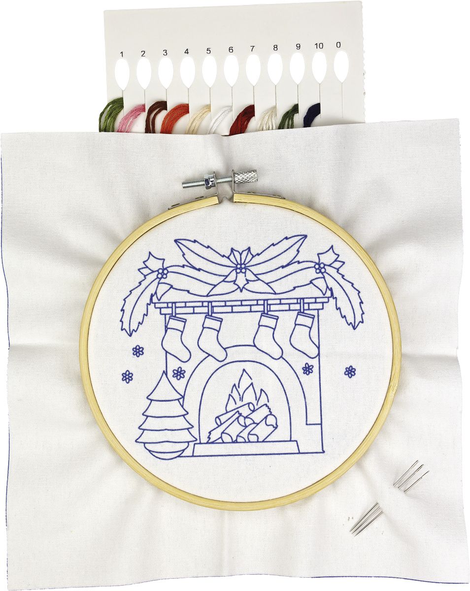 Gotowy zestaw do haftowania, zawierający: tkaninę 24x24 cm ze szkicem wzoru, tamborek o średnicy roboczej 15 cm, zestaw mulin, 3 igły, instrukcję w języku polskim. Wzór: świąteczny kominek.
