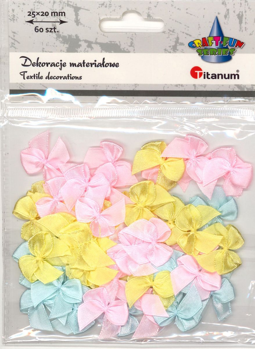 Dekoracje materiałowe, wzór: kokardki, wymiary: 25 x 20 mm, satynowe, kolory pastelowe: bladoróżowe, bladomiętowe, jasnożółte. 60 sztuk.