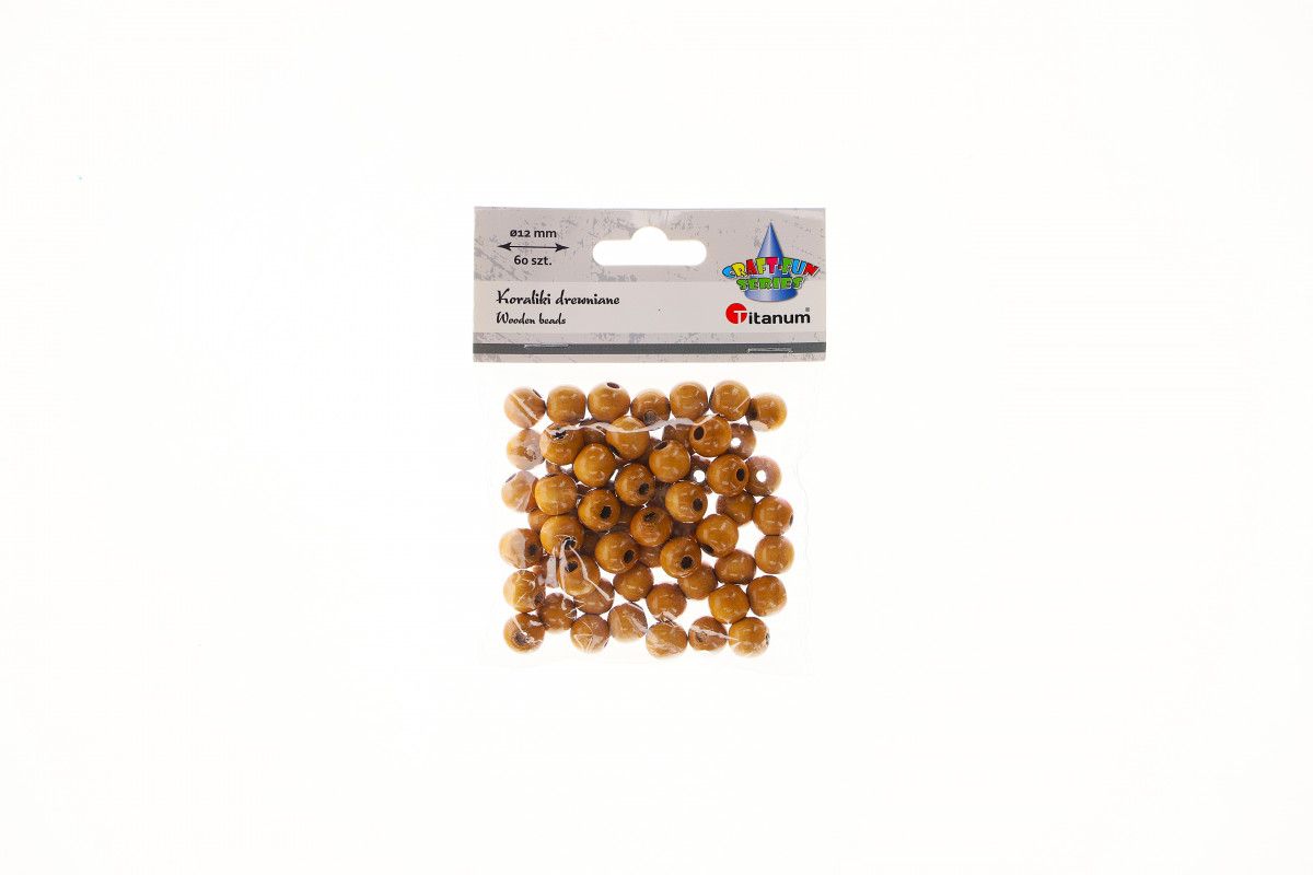 Koraliki drewniane, okrągłe, 12 mm, lakierowane jasnobrązowe. 60 sztuk.