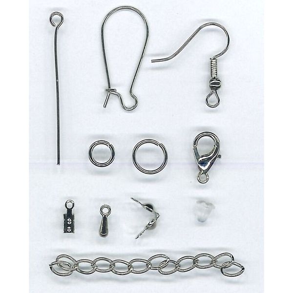 Akcesoria do biżuterii, 191 elementów, srebrne: szpilki jubilerskie z łepkiem (gwoździe) 35 mm - 15 szt., haczyki jubilerskie 35 mm - 15 szt., bigle zapinane 11 x 24 mm - 8 szt., bigle otwarte 18 x 19 mm z kulką i sprężynką - 8 szt., czapeczki ozdobne do koralików 7 mm - 30 szt., zapięcie karabińczyk 13 x 7 mm - 6 szt., kółko średnica 8 mm - 6 szt., kółko średnica 6 mm - 30 szt., łapaczka końcówka zaciskowa - 15 szt., łapaczka dziewczynka - 15 szt., zawieszka do przedłużki łańcuszka 8 szt., przedłużka łańcuszka 4,5-5cm - 5 szt., zatyczka silikonowa do kolczyka - 30 szt.
