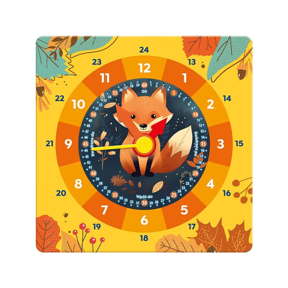 Pięknie zilustrowana zabawka edukacyjna w formie zegara. Tarcza zegara umieszczona jest na solidnej tekturze o rozmiarze 23 x 23 cm. Ruchome wskazówki z tworzywa, pozwalają na samodzielne ustawianie zarówno godzin, minut jak i sekund. Na tarczy znajdziemy oznaczenia pozwalające na wskazania w systemie 12 – sto jak i 24 – ro godzinnym. Dla łatwiejszej nauki wprowadzono oznaczenia „kwadrans do”, „wpół do”, jak i „00”. Zabawka pozwala w przyjemny i praktyczny sposób opanować znajomość zegara w towarzystwie sympatycznego liska z ilustracji.