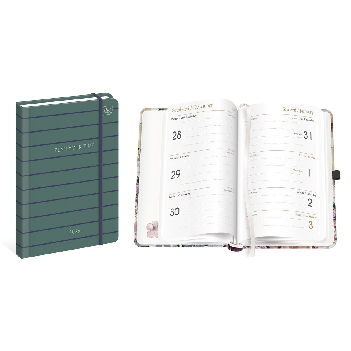 kalendarium: 1 tydzień na dwóch stronach miejsce na notatki przy każdym dniu twarda oprawa zamykany na gumkę papier 80 g okładka metaliczna lub matowa z lakierem wybiórczym kolorowa wyklejka tasiemka do zaznaczania strony